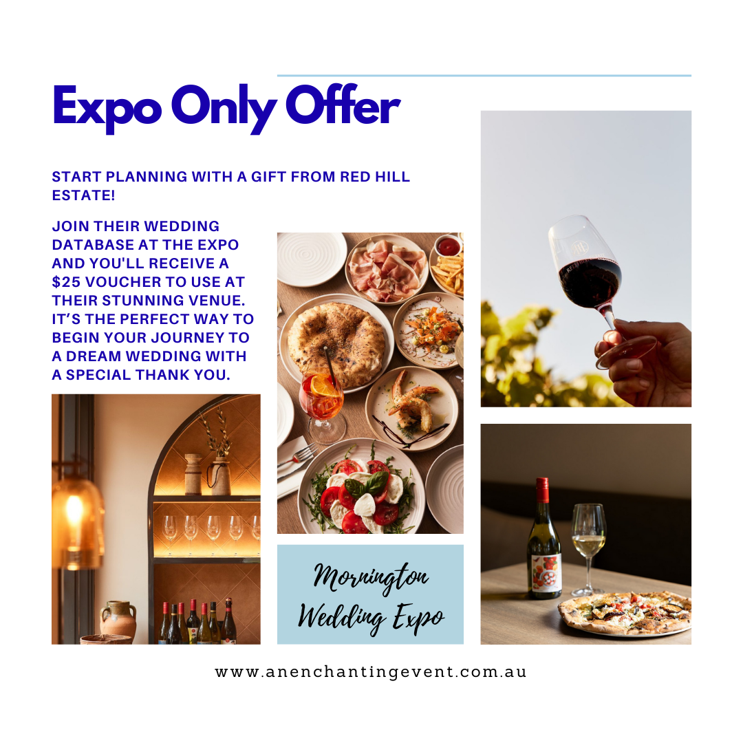 Take the first step toward your perfect day with a special gift from Red Hill Estate! At the expo, simply join their wedding database to receive a $25 voucher to use at their stunning venue. This isn’t just a voucher—it’s their way of saying thanks and helping them tailor future offers and inspiration directly to your unique vision. Visit their stand to sign up, enjoy a glass of wine, and discover what makes Red Hill Estate the perfect setting for your dream wedding.